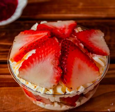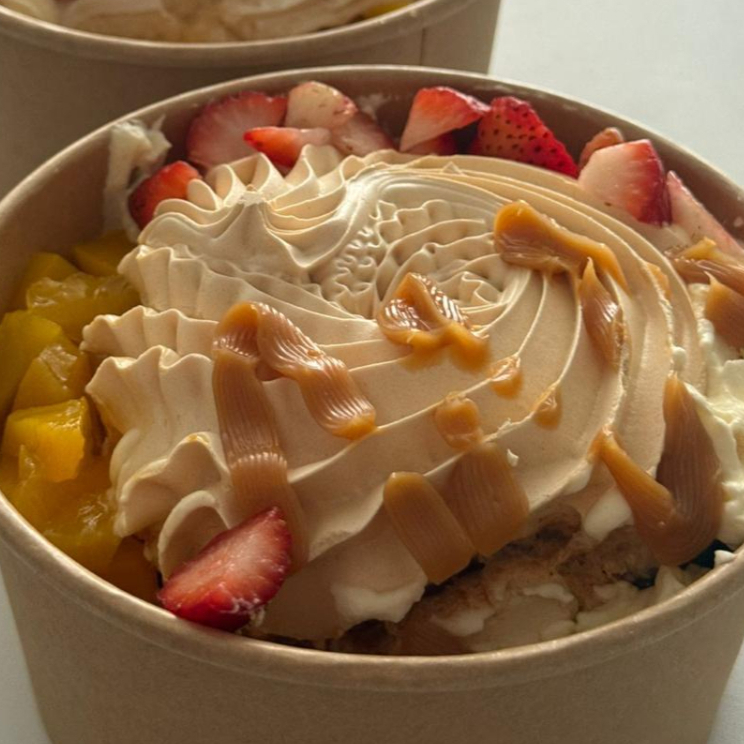 vaso de 5 oz Crema batida cremosa con trocitos de gelatina de limón, piña, mora y fresa.. Contiene leche.