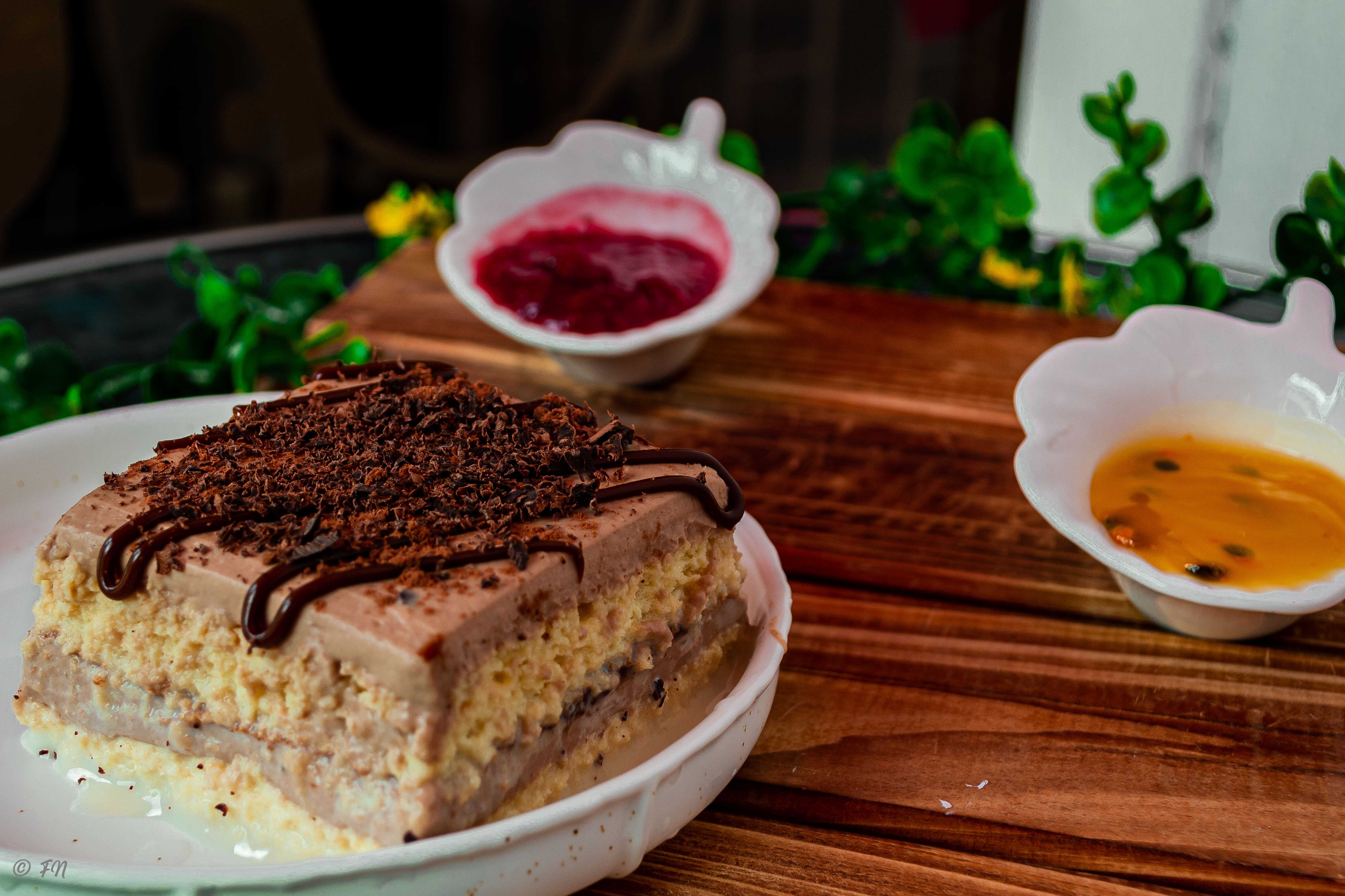 Bizcochuelo de vainilla con crema de chocolate entre capas bañado en nuestra mezcla de tres leches cubierto de crema de chocolate con rayadura de chocolate. Contiene: leche, huevo y gluten