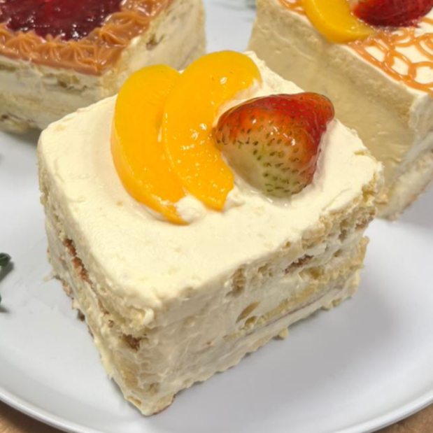 Bizcochuelo de vainilla con trocitos de durazno, guanábana y fresa entre capas bañado en nuestra mezcla de tres leches cubierto con trozos de melocotón y fresas. Contiene: leche, huevo y gluten