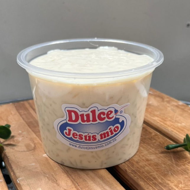 Arroz preparado en nuestra deliciosa mezcla de tres leches. Tamaño para compartir aproximadamente 1 litro, acompañado de uvas pasas. Contiene leche