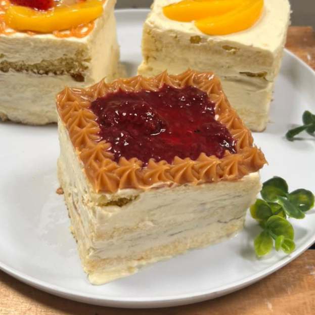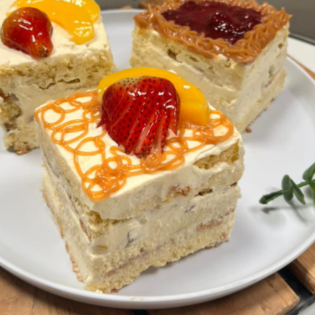 Bizcochuelo de vainilla con trocitos de melocotón y fresa entre capas bañado en nuestra mezcla de tres leches cubierto con trozos de fruta y arequipe. Contiene: leche, huevo y gluten