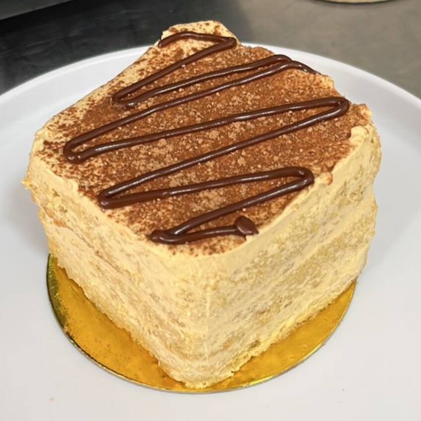 Bizcochuelo de vainilla con crema de café entre capas bañado en nuestra mezcla de tres leches cubierto de crema de café y crocante de galleta. Contiene: leche, huevo y gluten