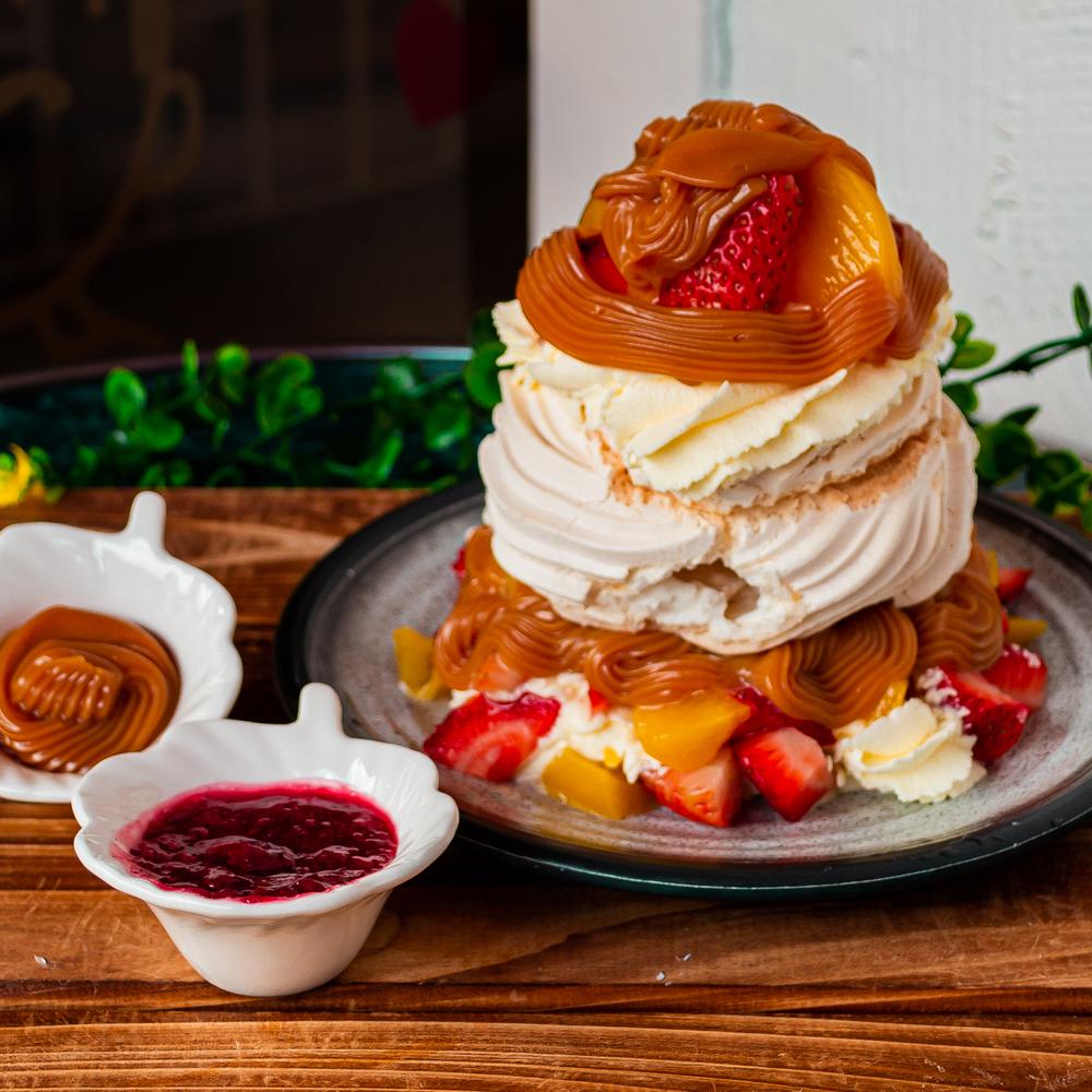 Galleta de hojaldre en capas con crema pastelera, crema batida y arequipe