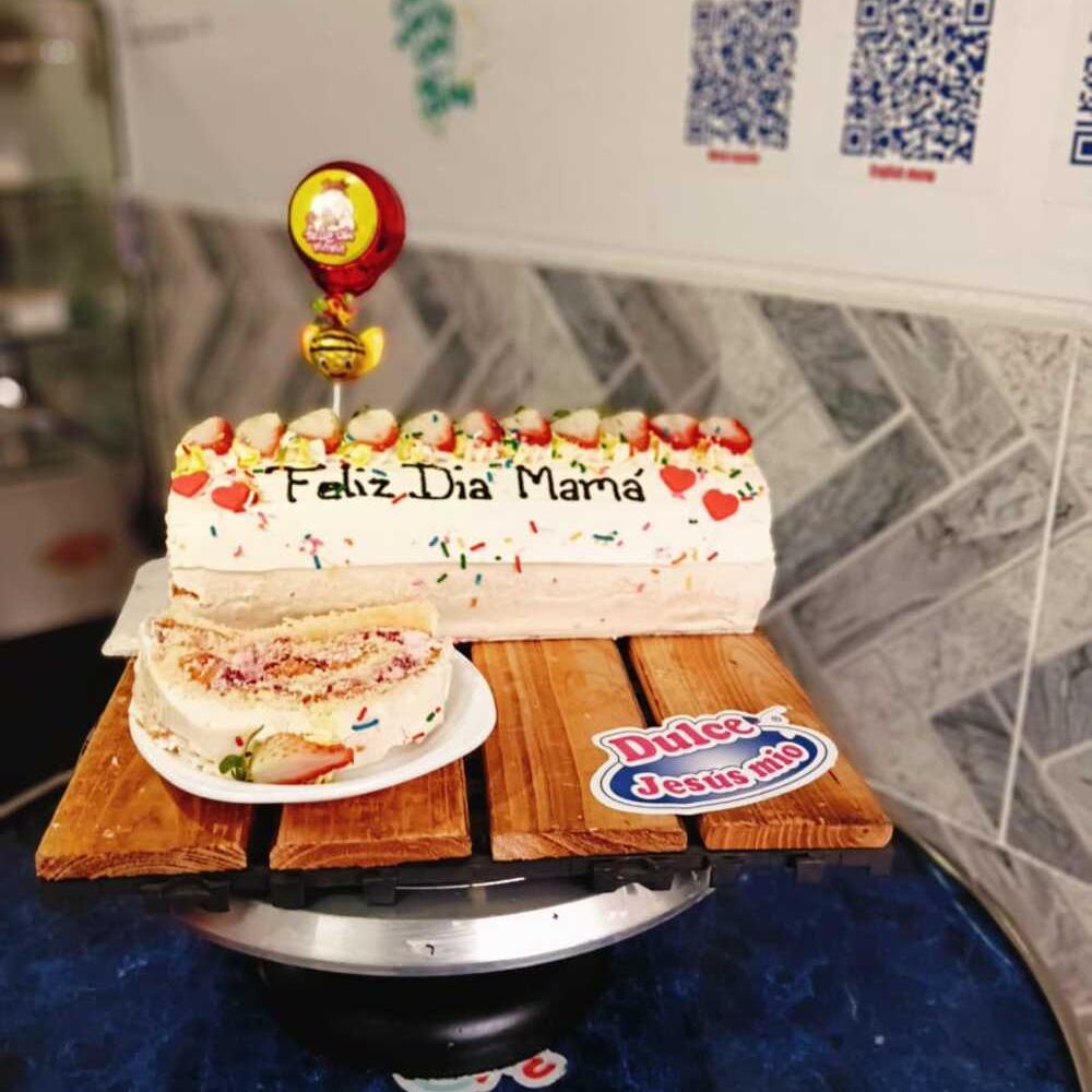 Deliciosa Torta bañada en tresleches con fresa melocotón y arequipe