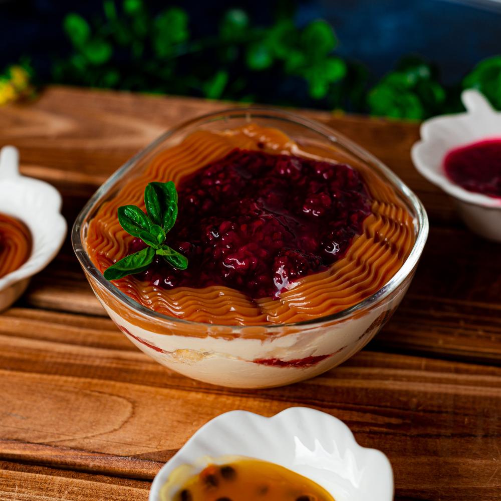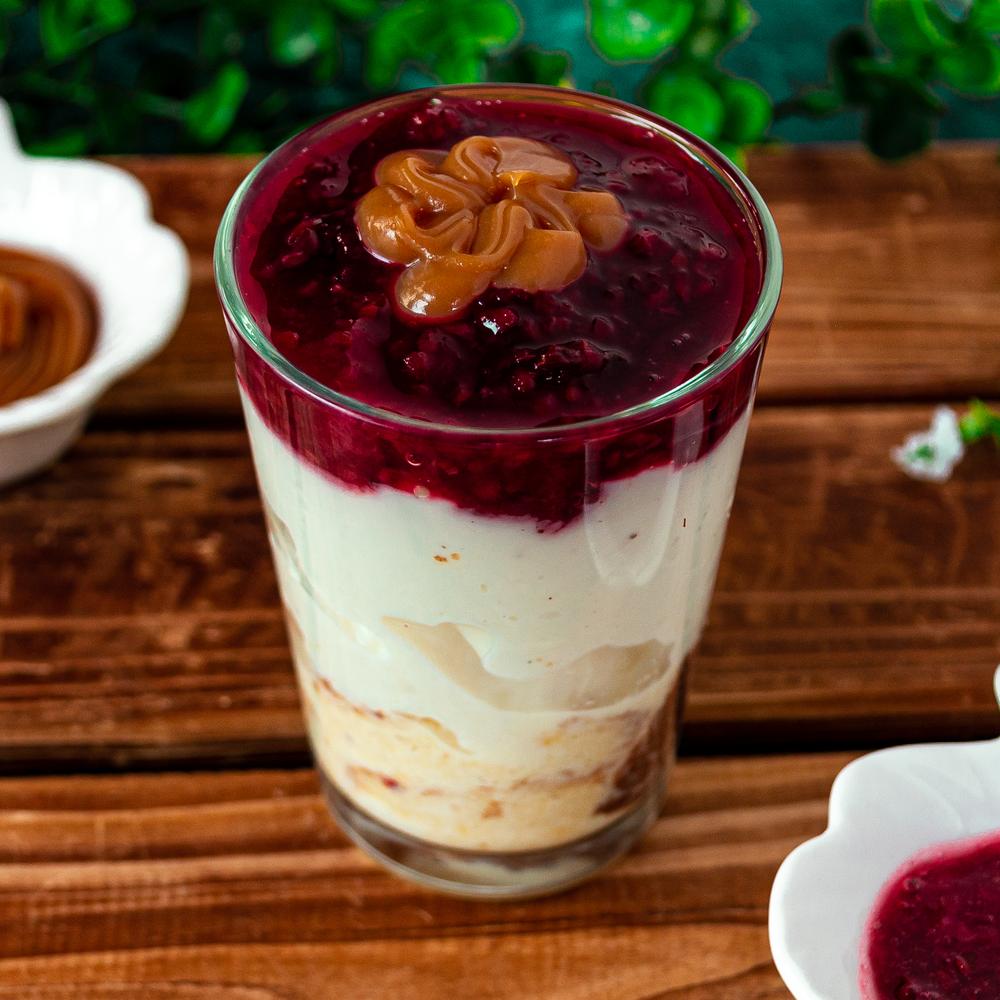 base de tarta de queso y galleta con arequipe y frutos rojos
