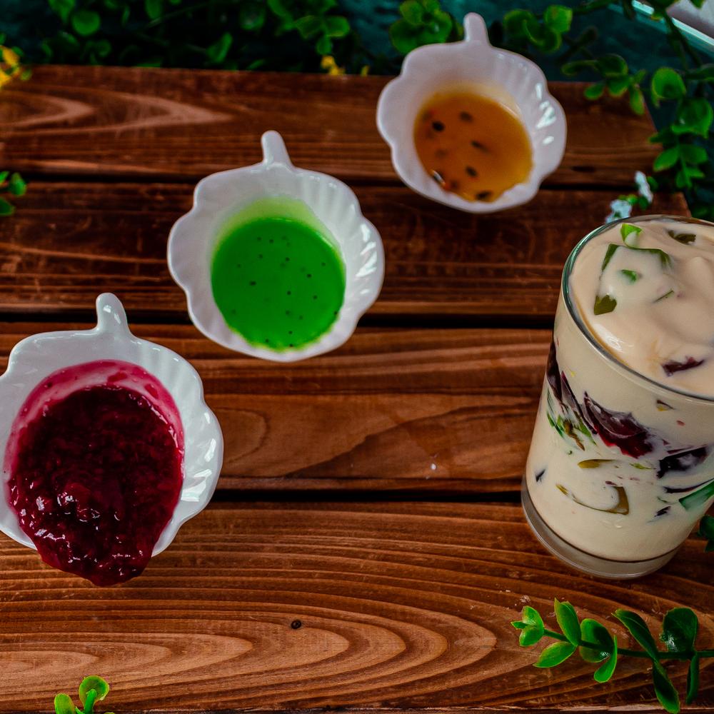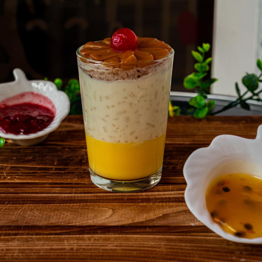 base de flan, arroz con leche, crema de chocolate y arequipe