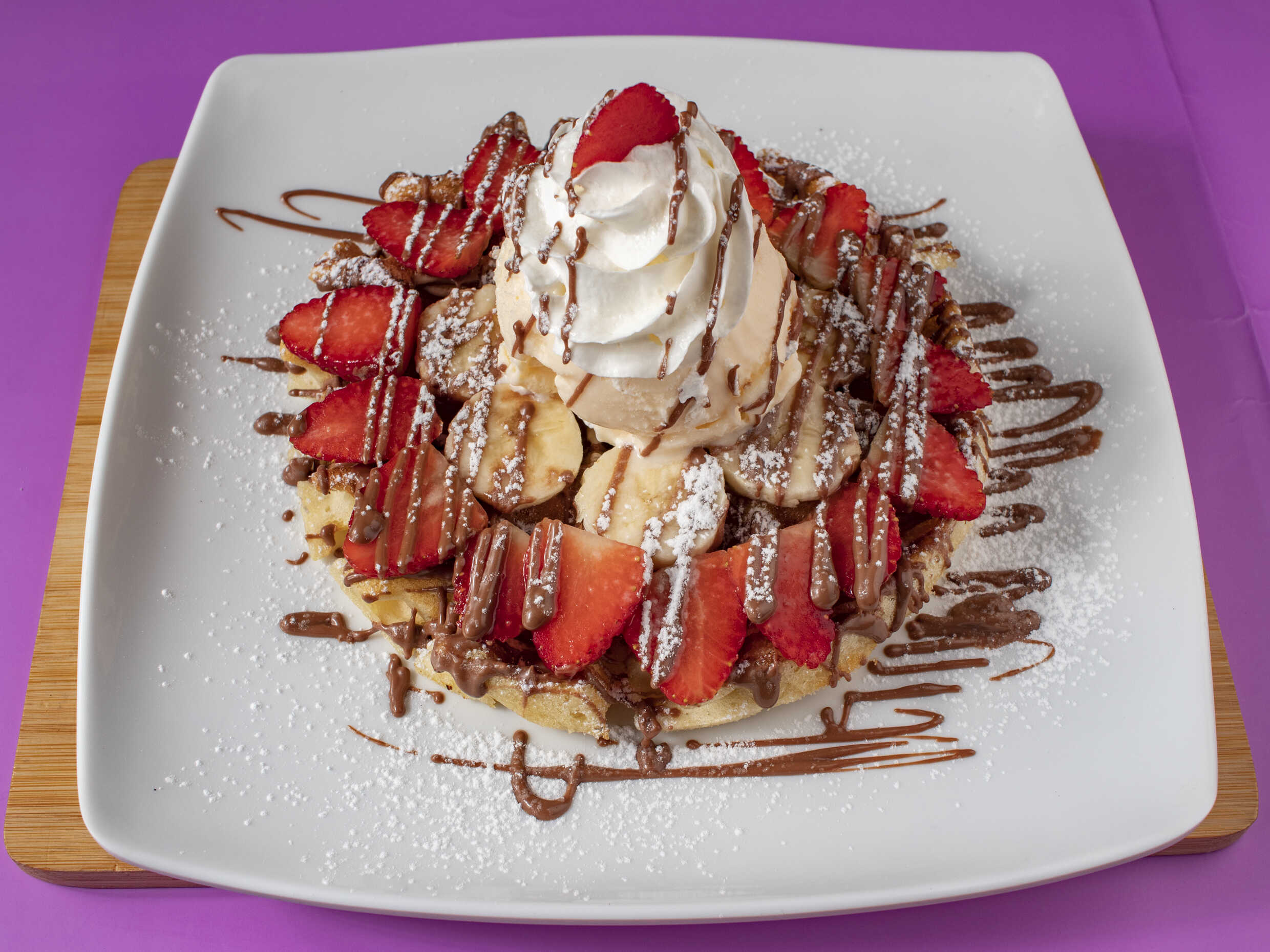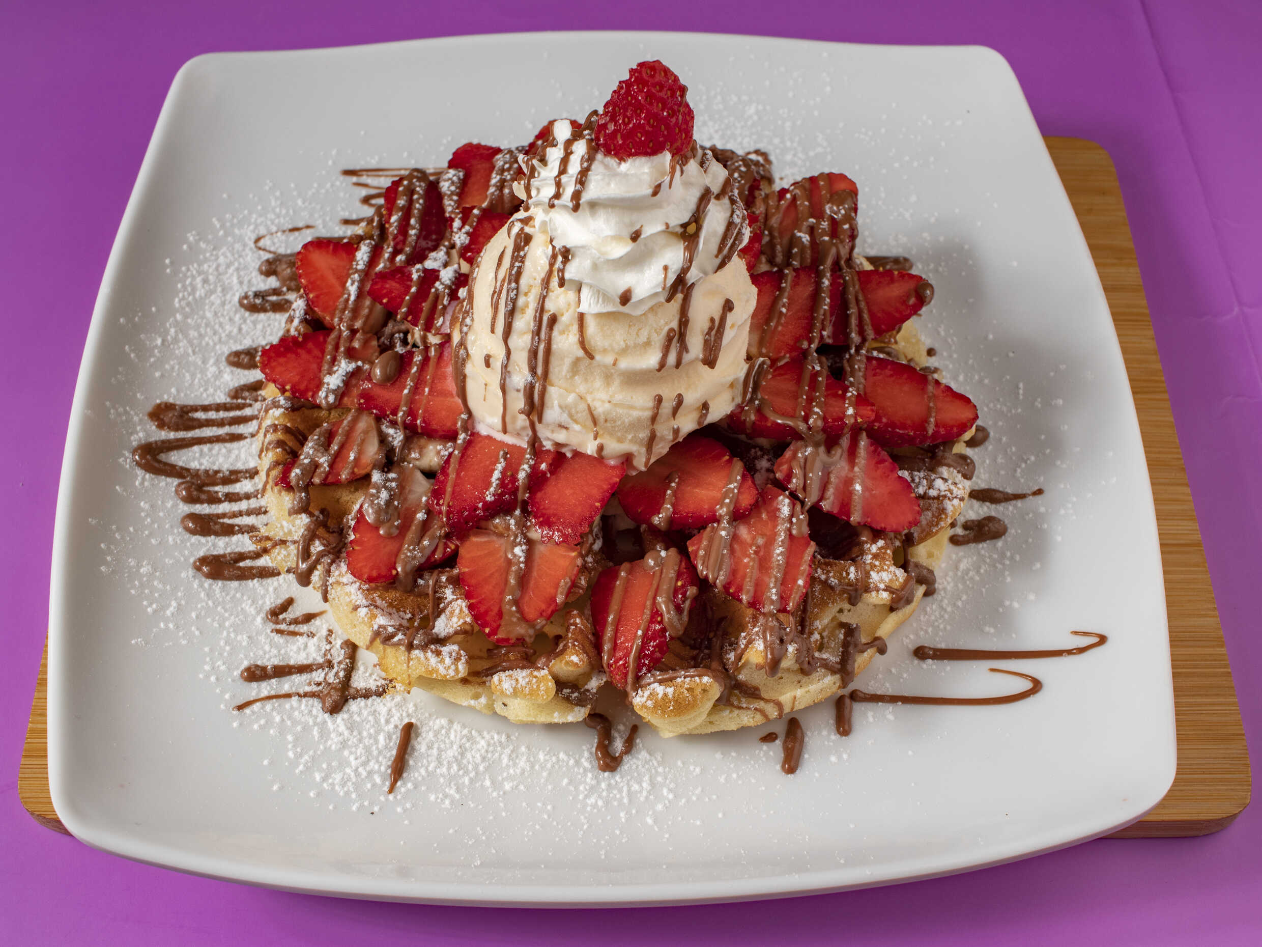 Waffle acompañado de helado, banano, fresas, salsa de chocolate, salsa de mora y chips de chocolate.