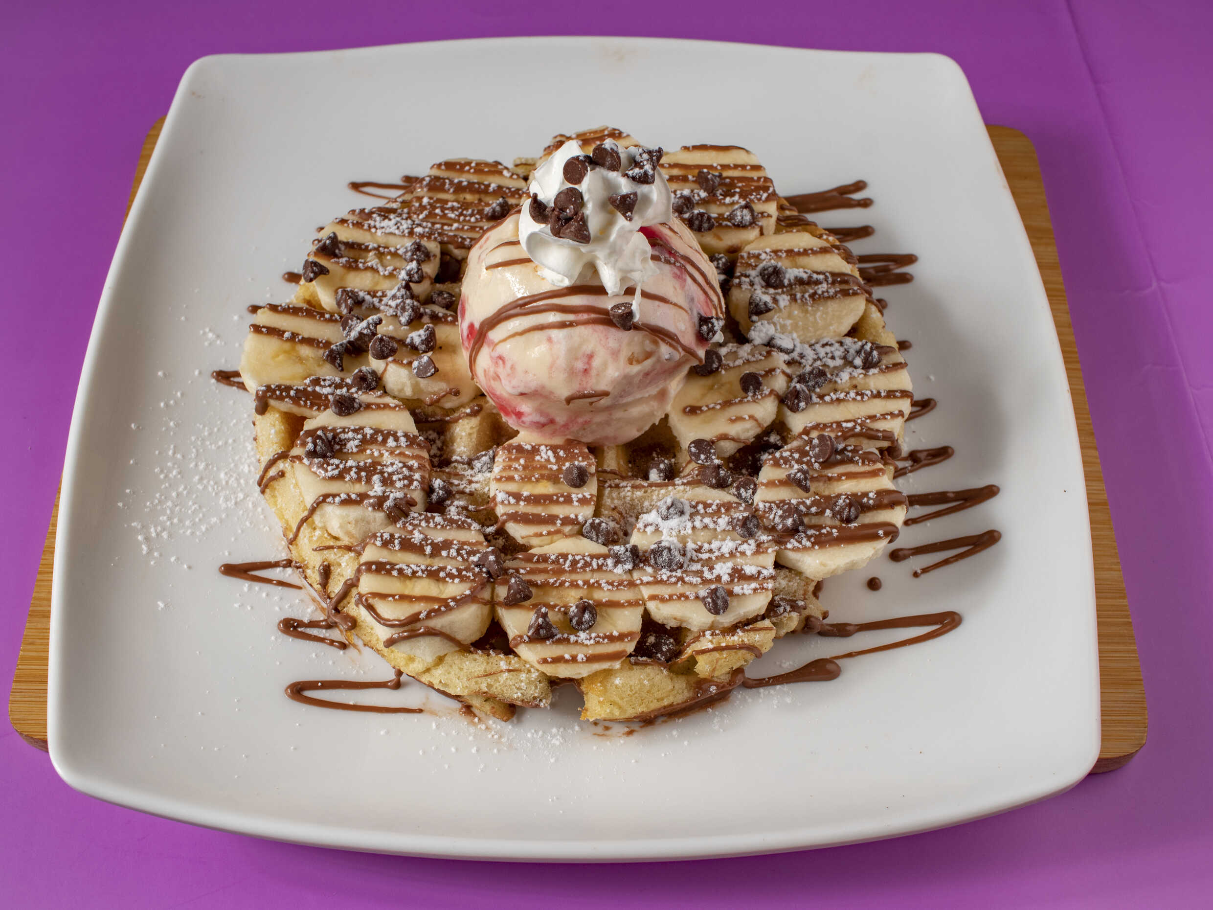 Waffle acompañado con helado, salsa de chocolate, salsa de arequipe, banano y chips de chocolate