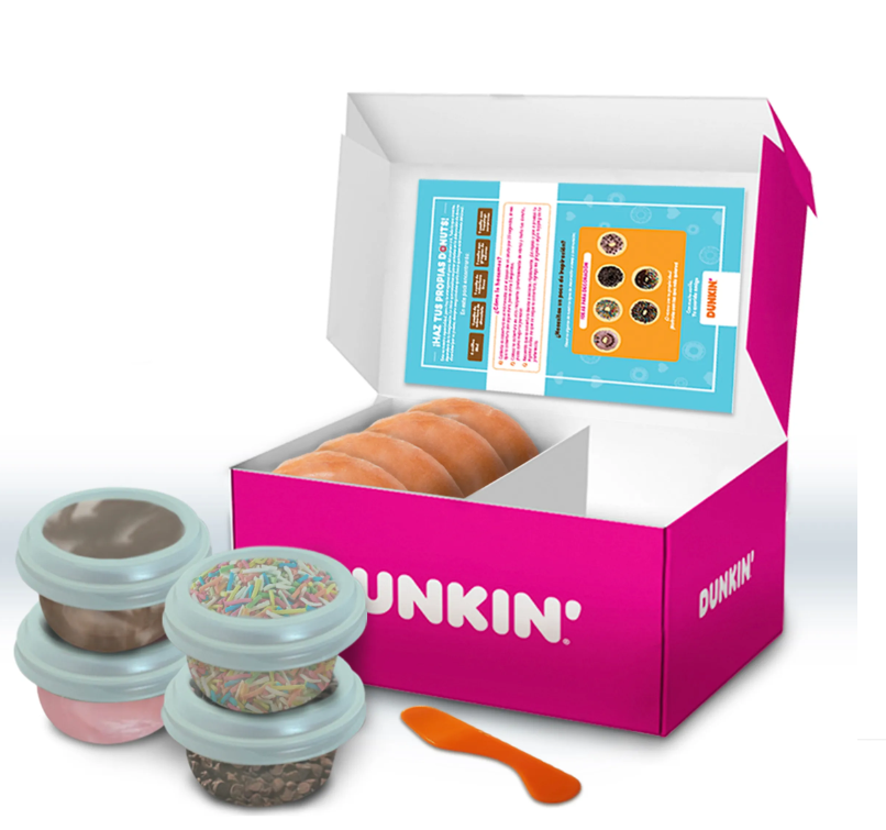 Caja Para Elaboración De Donuts. Contiene: 4 Donuts Anillo Miel, 1 Empaque Con Cobertura De Chocolate, 1 Empaque Con Frosting Rosado, 1 Empaque Con Chips De Chocolate Y 1 Empaque Con Grageas De Colores.