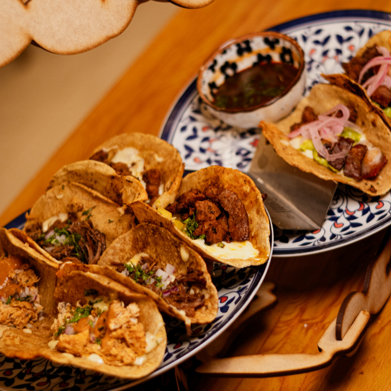 2 Tacos de pastor, 2 de cochinita, 2 de birria y 2 de tinga acompañado de salsa chingonas y birria.