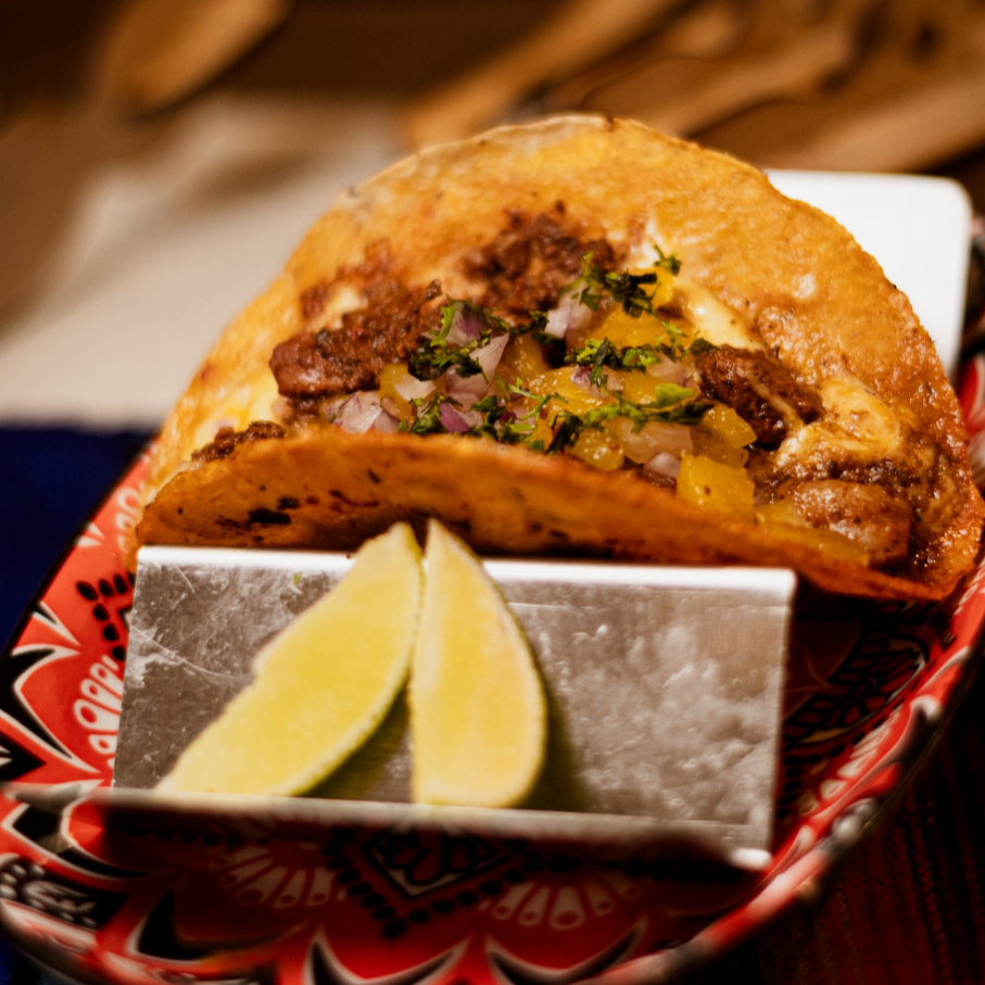 Tortilla de trigo dorada en queso fundido, acompañada de carnitas, cebolla roja, guacamole y totopos.
