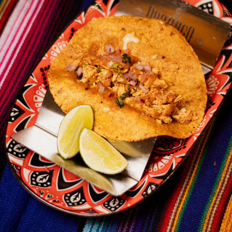Tortilla frita, lechuga crocante, queso mozzarella, carnitas a tu gusto, pico de gallo, guacamole, frijol refrito y crema.