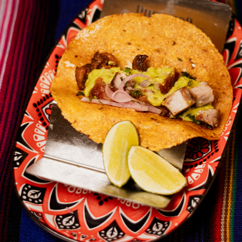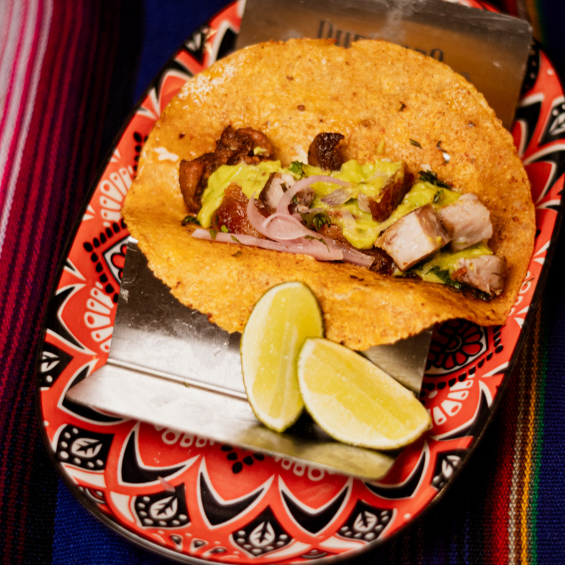 Chicharrón crocante, cochinita pibil, aguacate y cebollitas.
