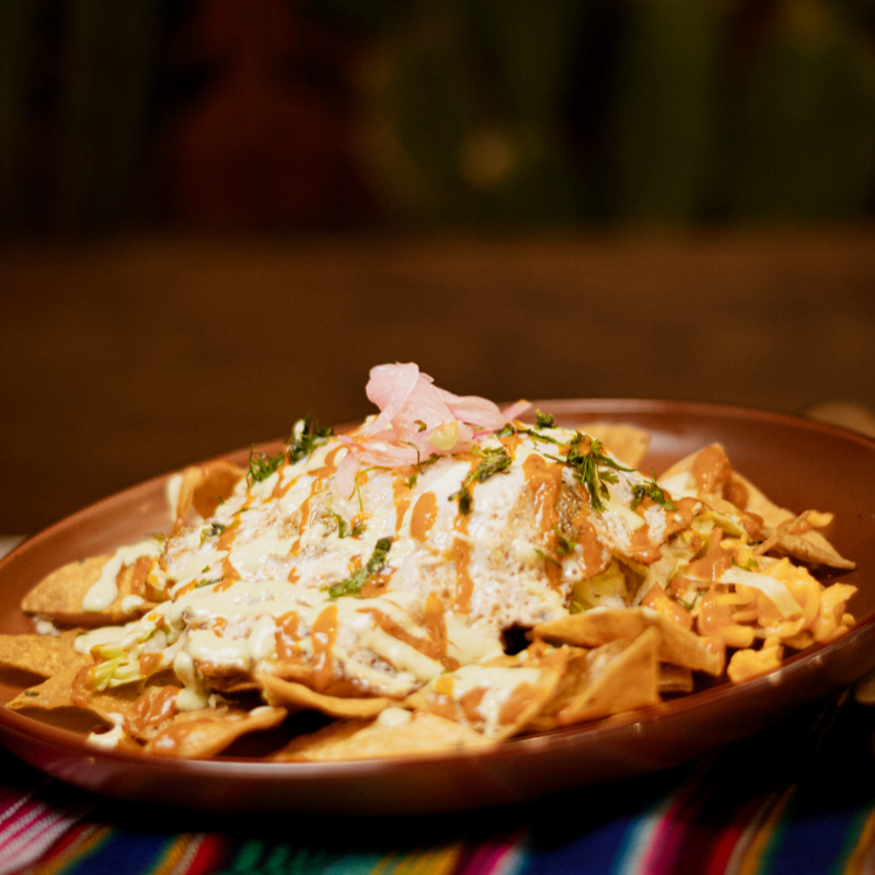 Tortilla frita, acompañada de carnes a tu elección, bañadas en salsa verde poblana, queso mozzarella, pico de gallo, aguacate, sour cream y lechuga crocante.