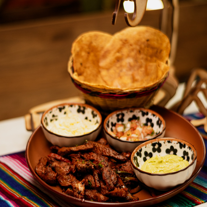 Arma tu taco 300gr de res asada en su punto, acampañada de pimentos tatemados, cebolla roja, tortilla, salsa de la casa y queso cheddar mas salsas acompañantes.
