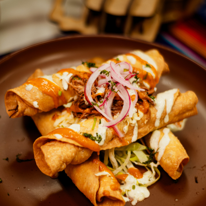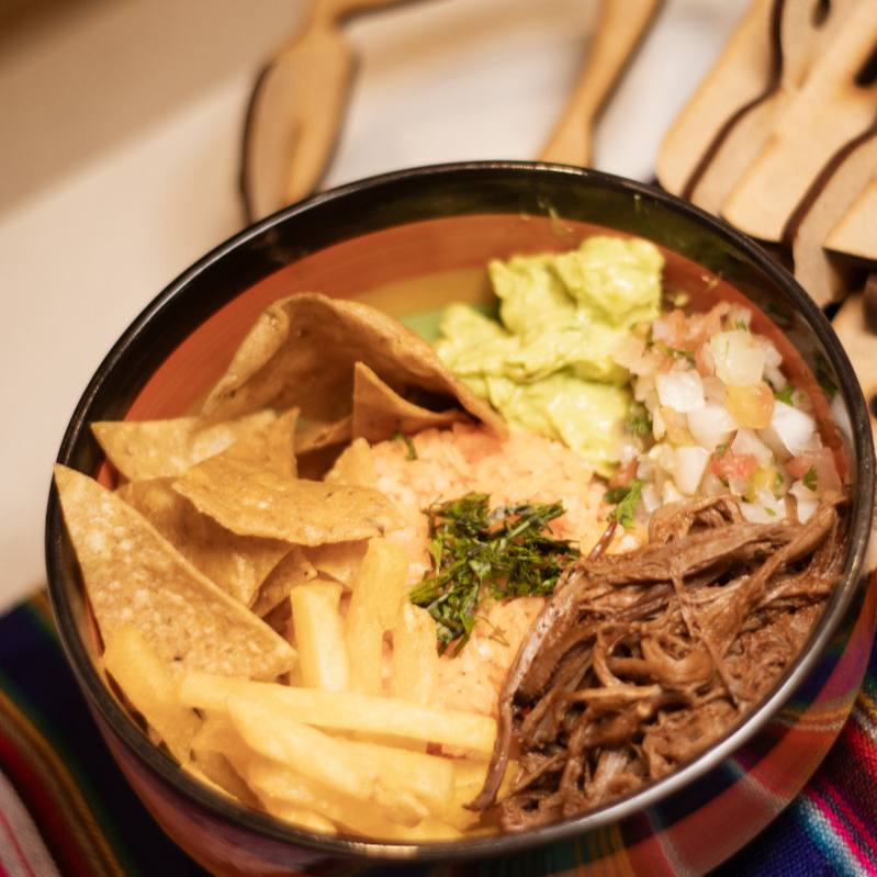 Acompañados de frijol refrito, carne de birria, queso cheddar, pico de gallo, guacamole y lechuga crocante.