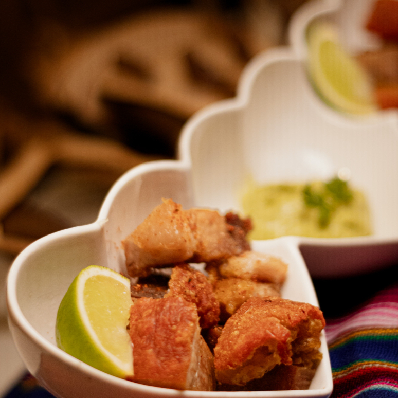 Panceta de chicharrón carnudo, acompañado de guacamole y limón.