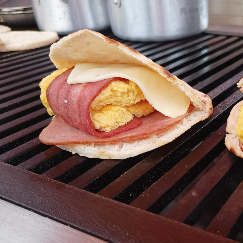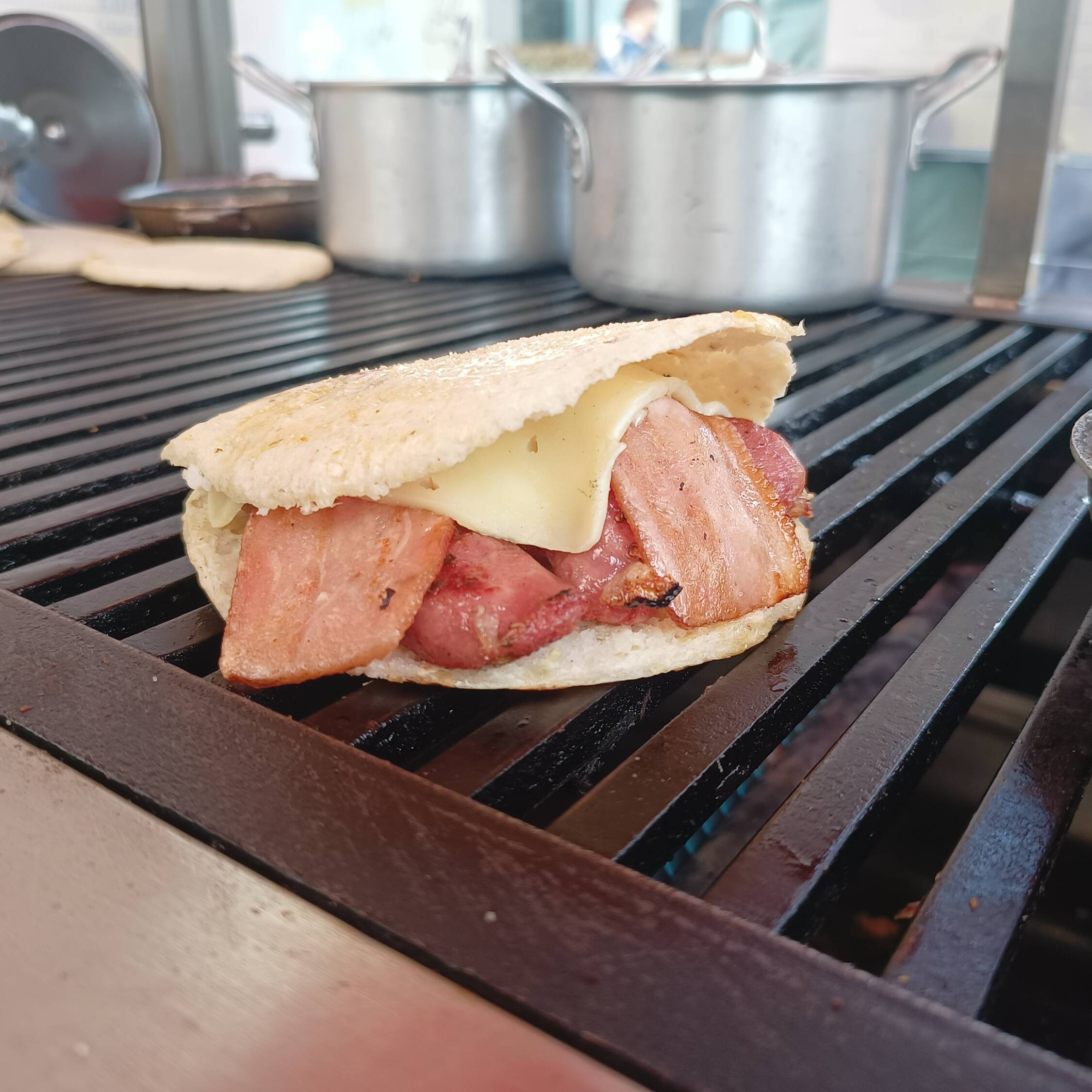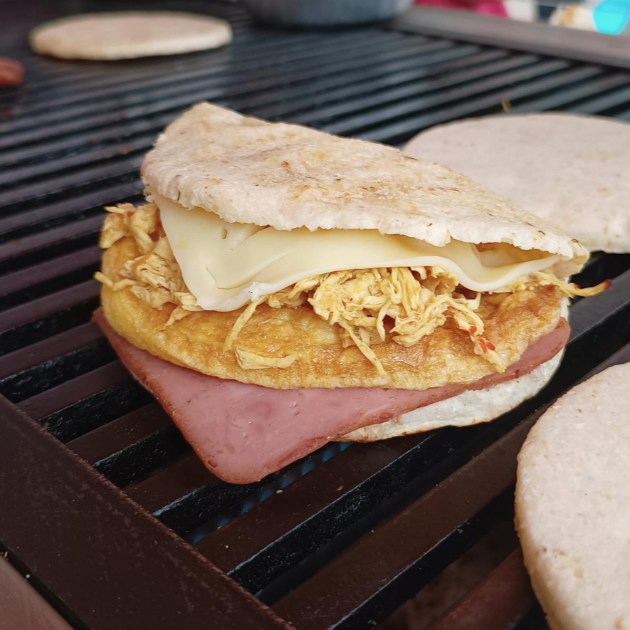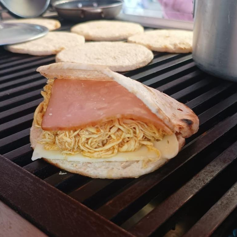 Combinación clásica de jamón de primera calidad y queso derretido en arepa de maíz.
