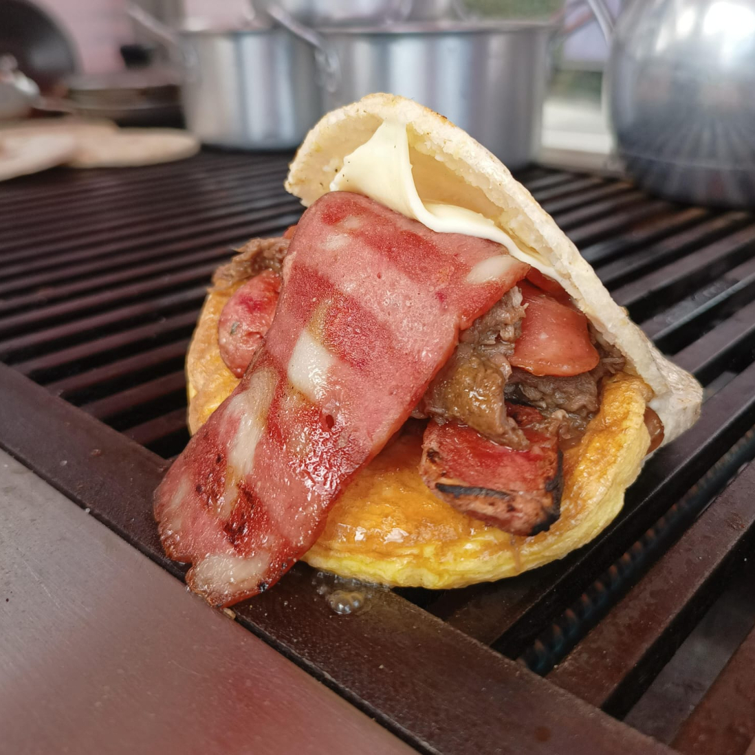 Opción de pollo o carne, con chorizo, huevos, jamón, queso y tocineta.