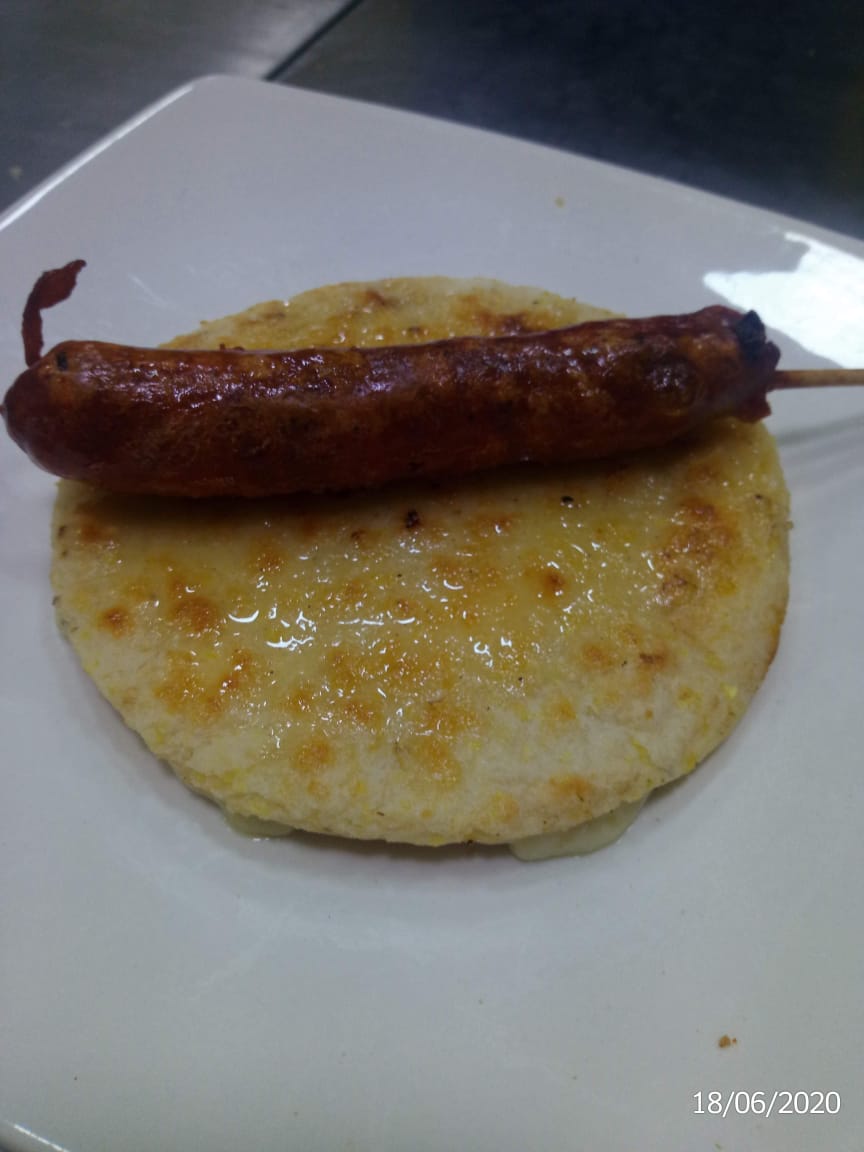 Arepa de maíz peto rellena con queso doble crema acompañado de chorizo