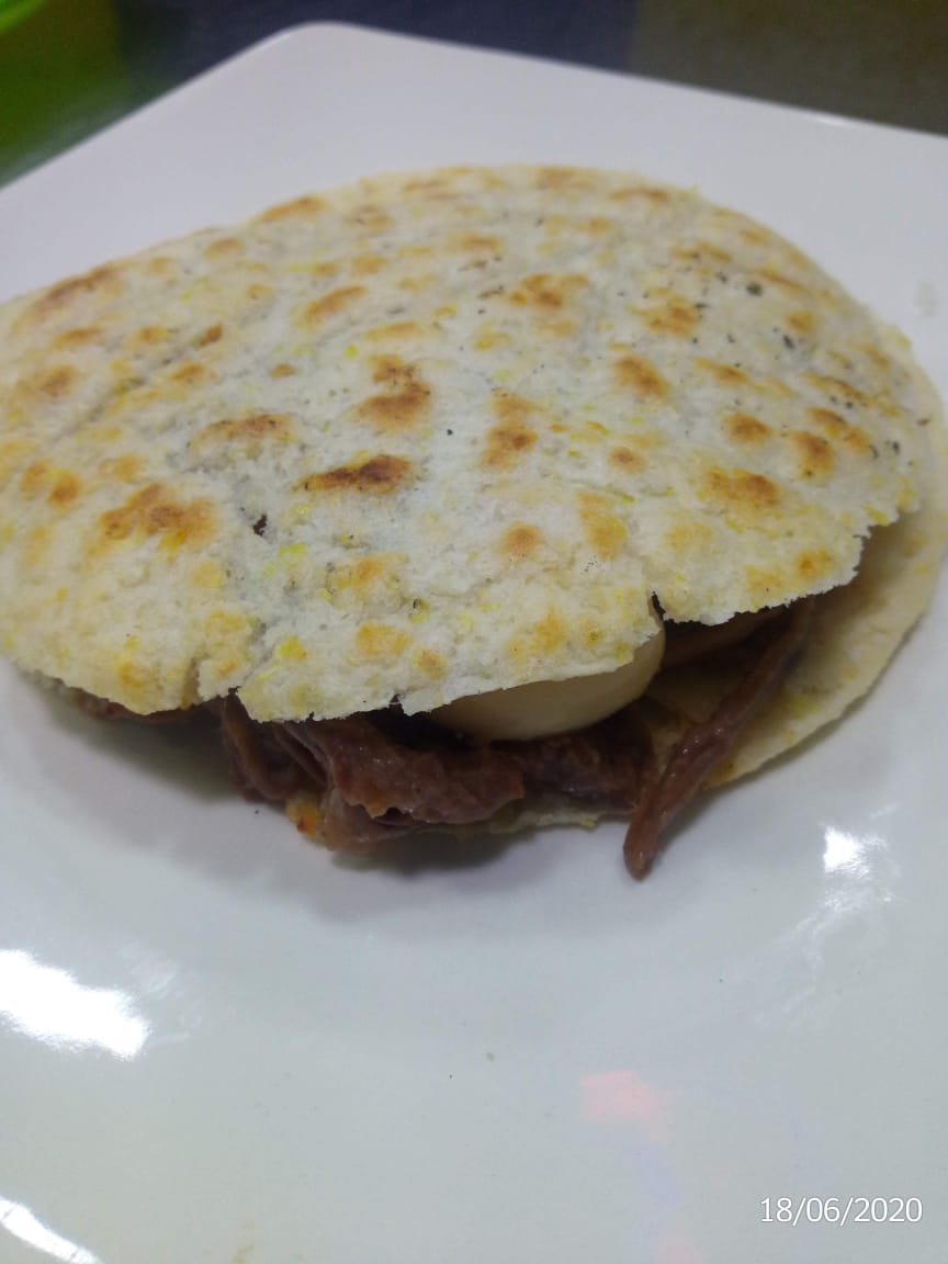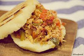 Arepa de maíz peto con pollo desmechado y queso doble crema