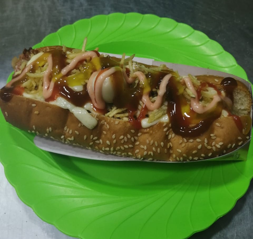 Perro caliente con chorizo, cebolla, jamón, salsas, queso, huevo de codorniz, papa chip