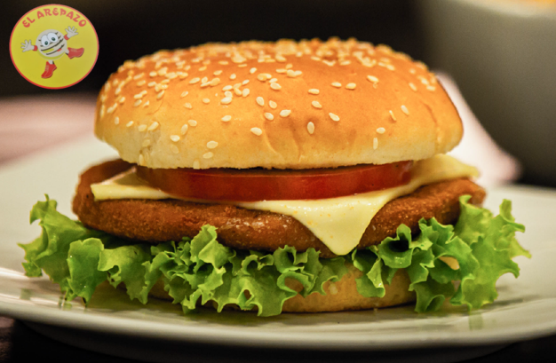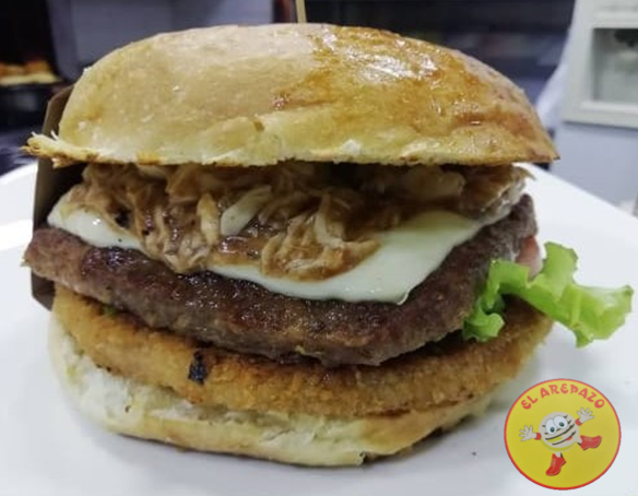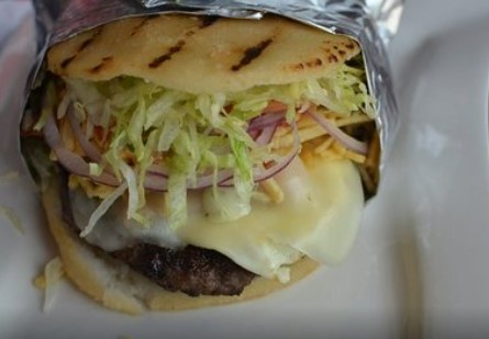 Hamburguesa en arepa con lechuga, tomate, cebolla, salsas, queso, jamón y huevo de codorniz