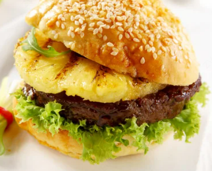 Hamburguesa en pan con lechuga, tomate, cebolla, salsas, piña en trozos, queso, jamón y huevo de codorniz