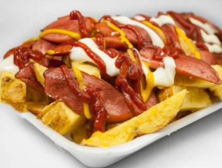 Porción de papa con salchicha Zenú, pollo desmechado, champiñón, jamón, cebolla, queso y huevo de codorniz