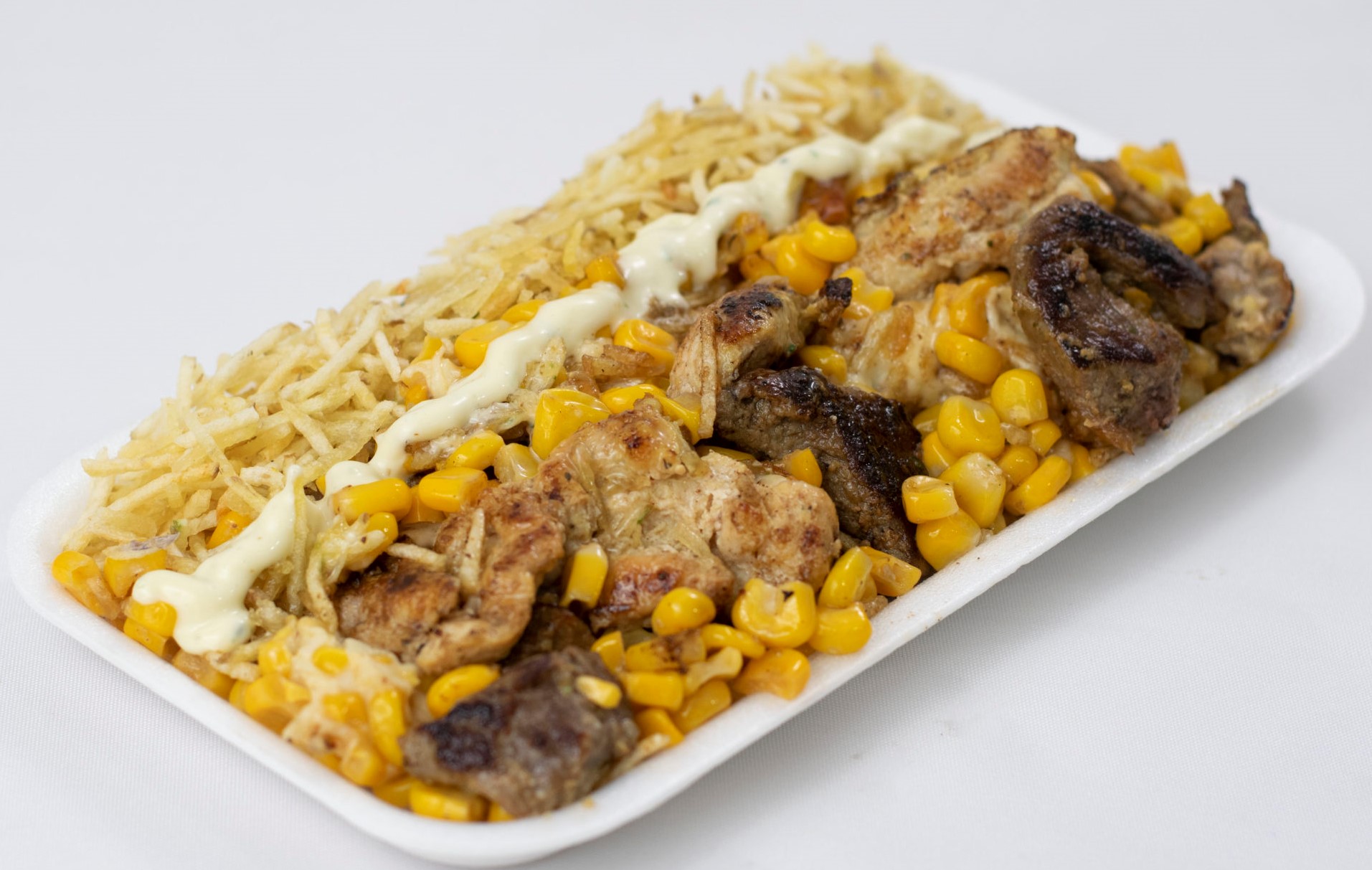 Ensalada (tomate, lechuga y cebolla), papa chip, pollo desmechado, carne, papa francesa, mazorca, queso y huevo