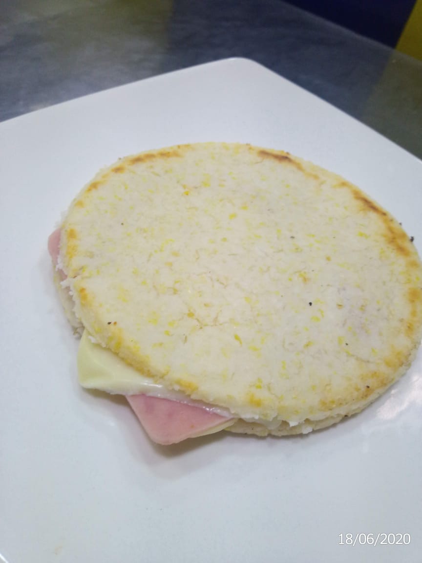 Arepa de maíz peto rellena con queso doble crema y jamón