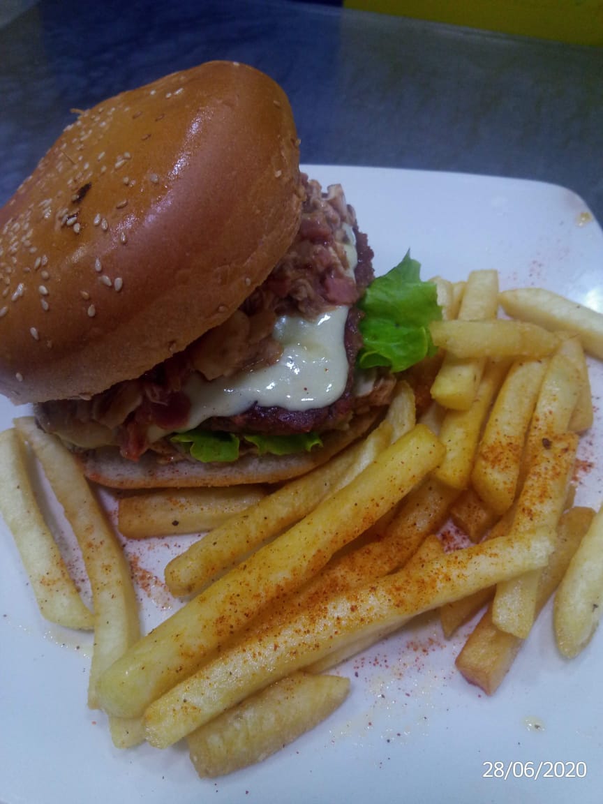 Hamburguesa con lechuga, tomate, cebolla, salsas, carne, queso, jamón y huevo de codorniz + papas a la francesa