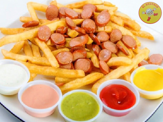Porción de papa con salchicha Zenú, pollo desmechado, champiñón, jamón, cebolla, queso, huevo de codorniz, mazorca y chorizo