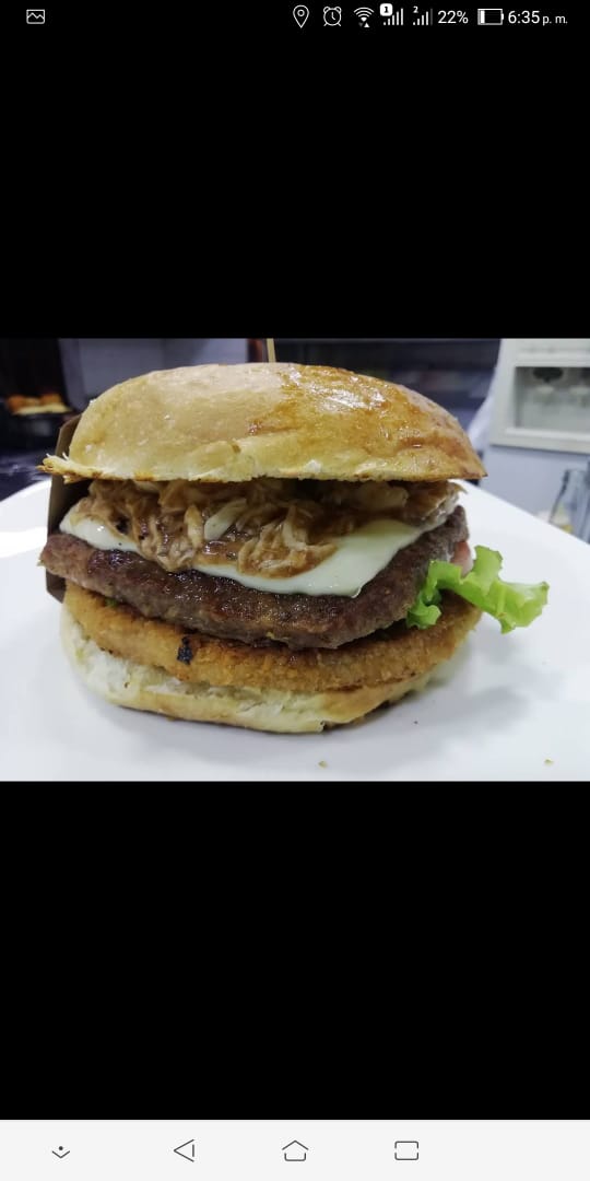 Hamburguesa en pan doble carne con lechuga, tomate, cebolla, salsas, queso, jamón y huevo de codorniz