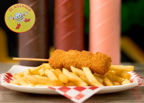 Perro caliente con salchicha Zenú tipo americana, cebolla, jamón, salsas, queso, huevo de codorniz, papa chip, pollo y champiñón + papa francesa