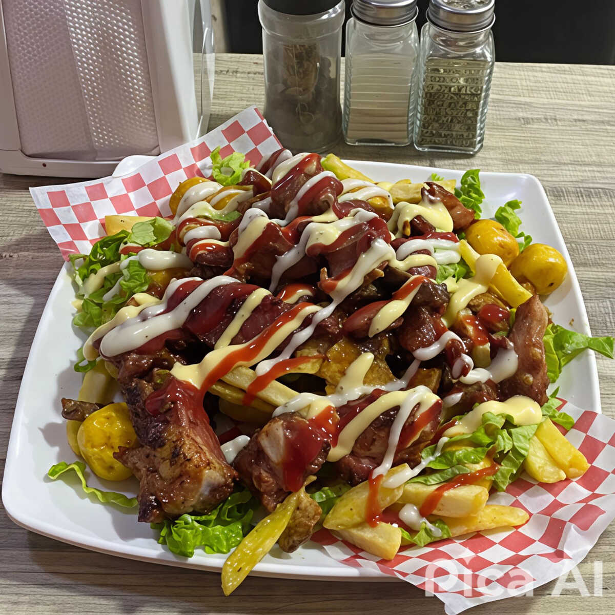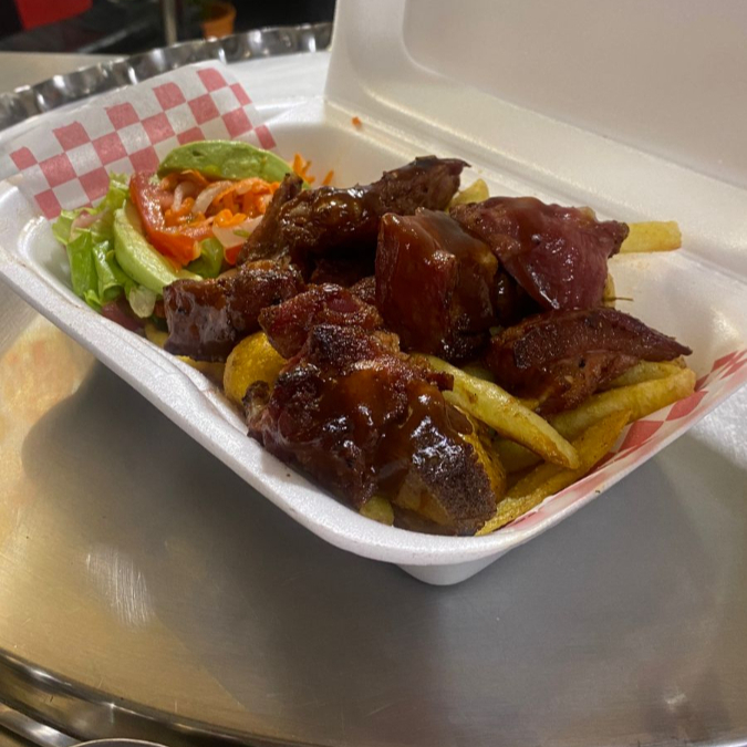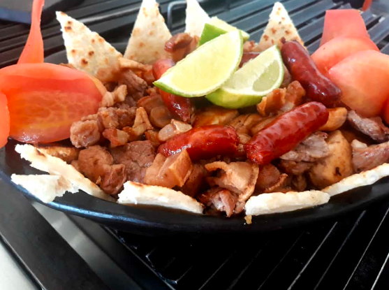 Costillas BBQ , carne picada , pechuga picada , chorizo , papa a la francesa.