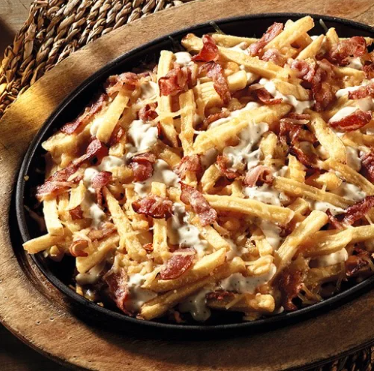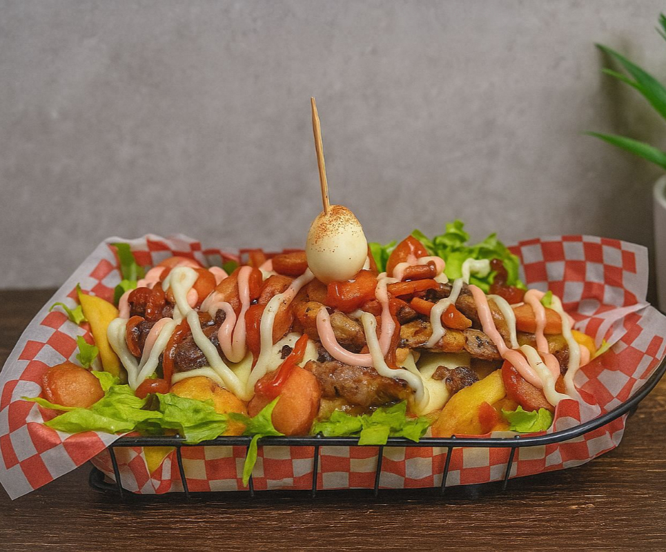 Porcion de papa a la francesa , porcion de papa criolla , carne desmechada , cebolla , tocineta , huevo frito , salchicha Zenú , queso , salsas ( tomate, mayonesa y mostaza).