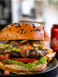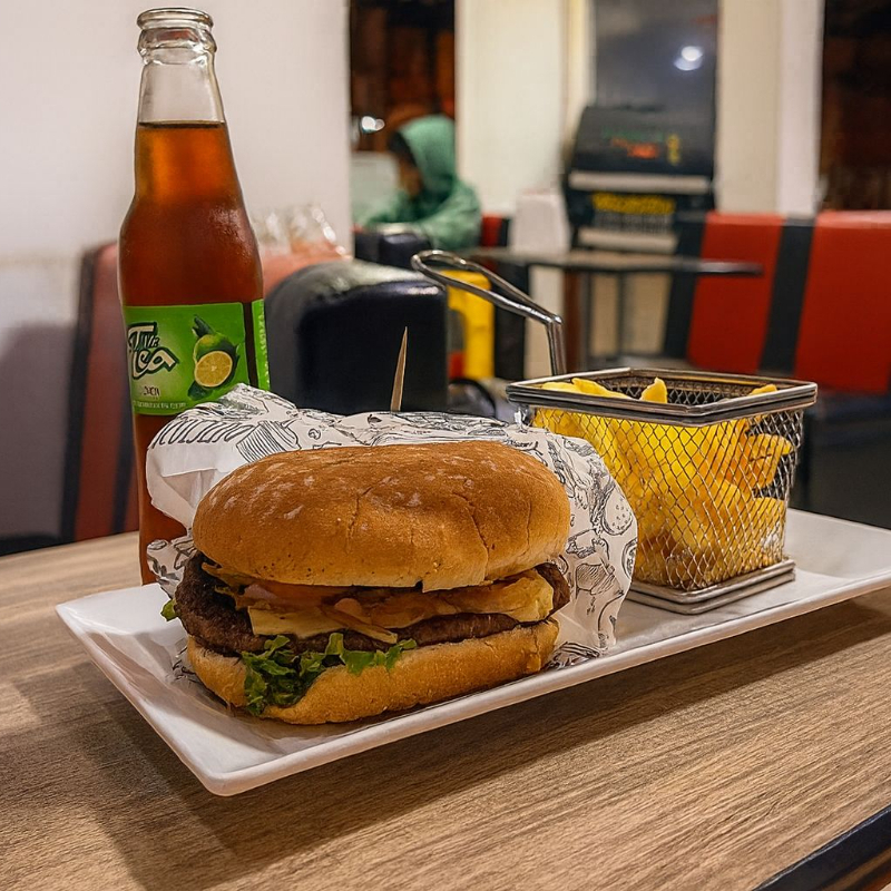 Deliciosa hamburguesa con pan artesanal 150 gms de carne de res, acomapañda de vegetales frescos y salsas + papa a la francesa ygaseosa de 250 ml