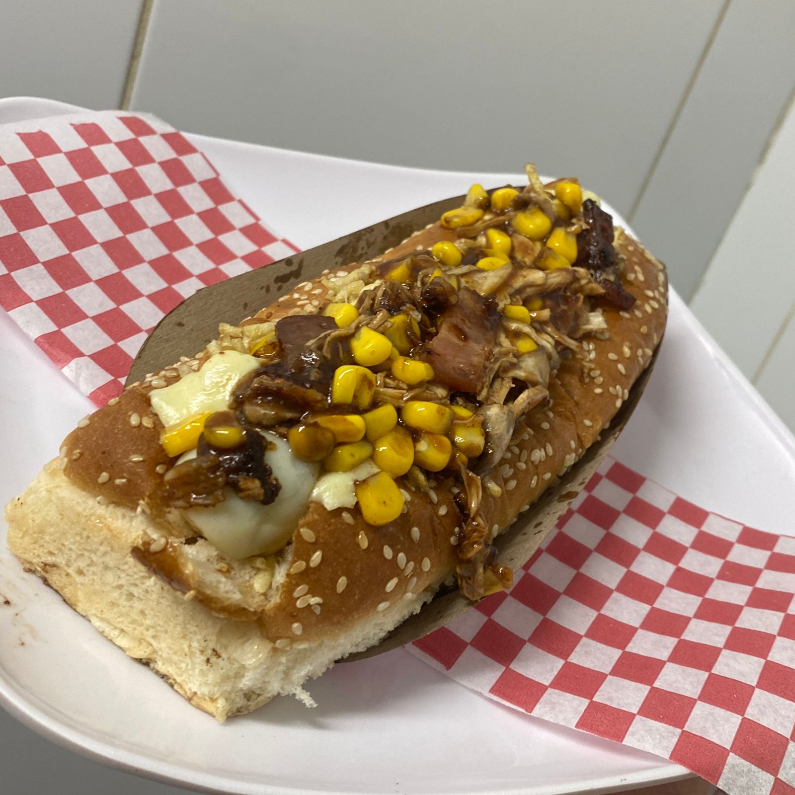 Maíz , carne desmechada , pollo , papa chip , huevo codorniz , queso mozzarella , salsas ( tomate, mayonesa y mostaza).
