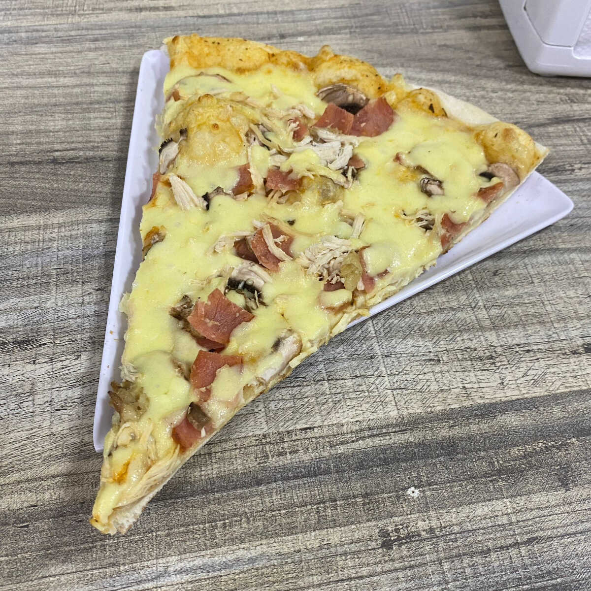 Pollo y carne desmechada , champiñón , jamón , queso y salsa napolitana.