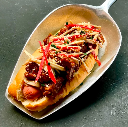 Salchicha americana zenu , papa chips , jamón , piña , pollo desmechado y salsas ( tomate, mayonesa y mostaza).