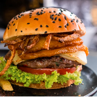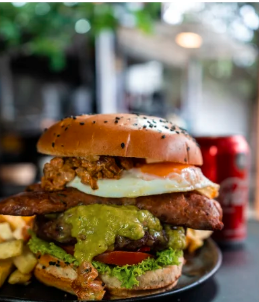 Lechuga tomate carne 100% res , cebolla grillet , carne desmechada , tocineta , aguacate , queso mozzarella y salsas ( tomate, mayonesa y mostaza).
