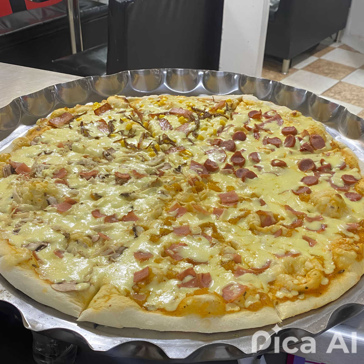 Pollo y champiñones , jamón, queso y salsa napolitana.