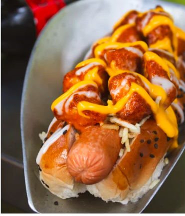 Salchicha americana zenu , papa chip , champiñón , maiz, tocineta , huevo de codorniz , queso , salsas ( tomate, mayonesa y mostaza).