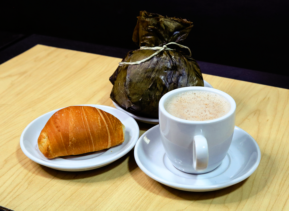 Delicioso tamal acompañado de bebida caliente puede ser café o chocolate y pan.
