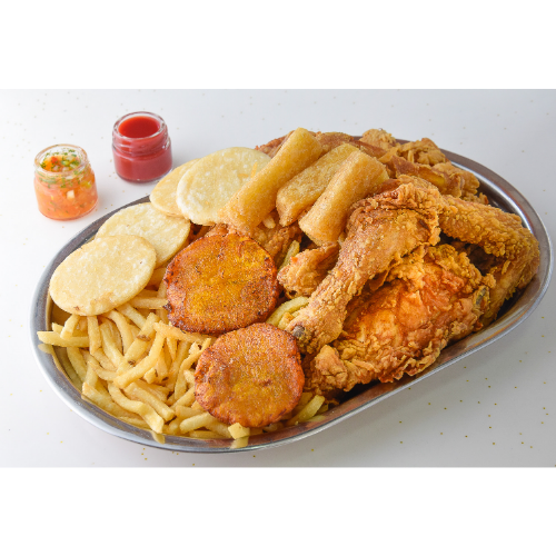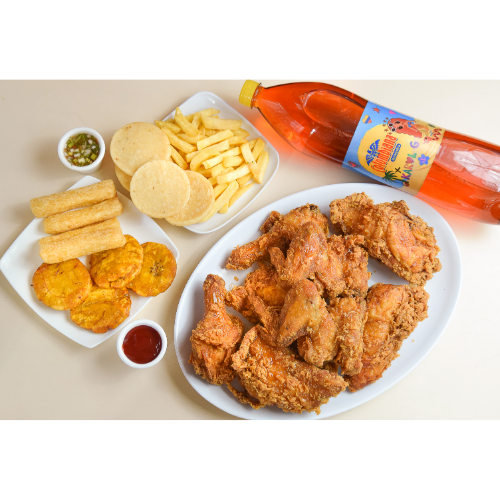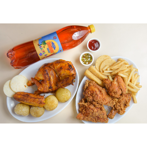 Medio Pollo Asado*1 + Medio Pollo Broaster*1 + Porción de Papas francesas*1 + Porción de Papas Cocidas*1 + Plátano Maduro*1 + Porción Arepas*1 + Gaseosa Pos Tobón 1*1