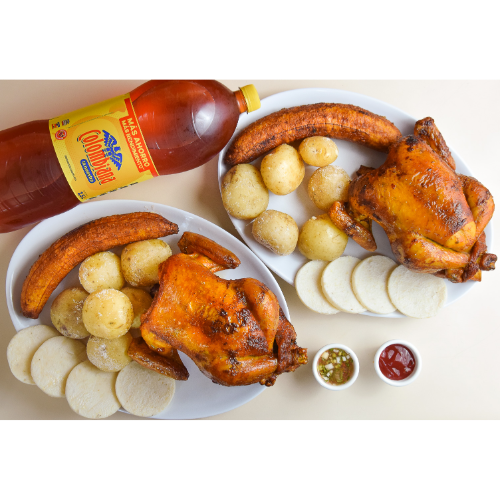 Pollo Asado*1 + Porción de Papas Cocidas*1 + Plátano Maduro*1 + Porción Arepas*1 + Gaseosa Econolitro