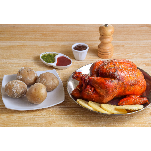 1 Pollo asado con 4 papas saladas y 4 arepas