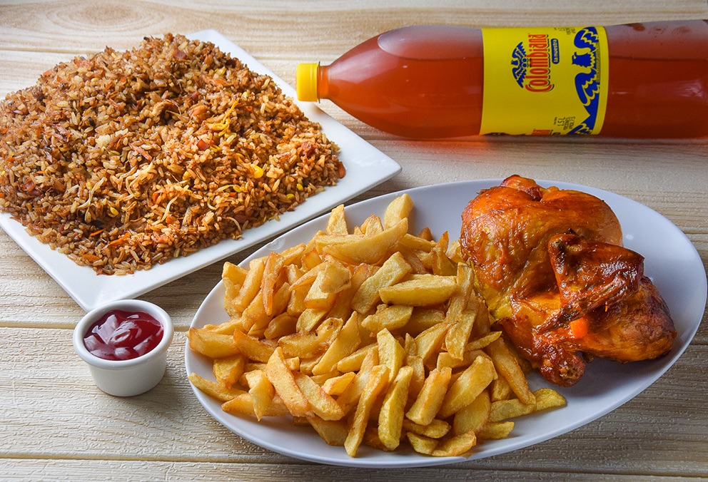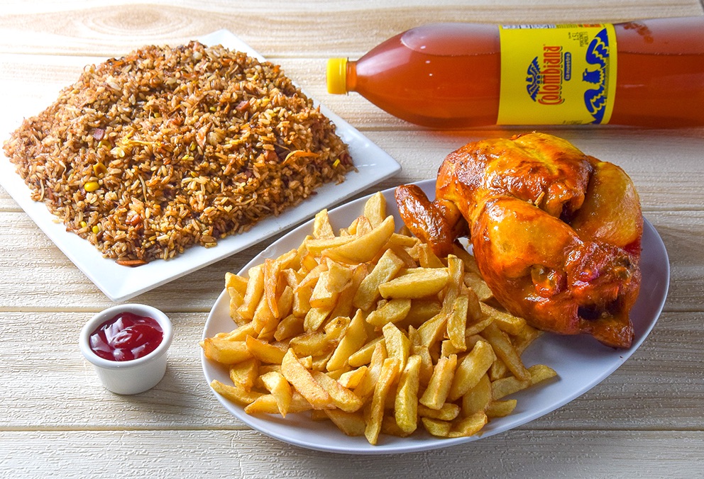 Caja de arroz para 4 personas*1 + Medio Pollo Asado*1 + Porción de Papas francesas*1 + Gaseosa Postobón Econolitro*1