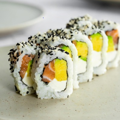 Arroz, alga nori, queso crema, salmón, aguacate cubiertos con semillas de ajonjolí.
